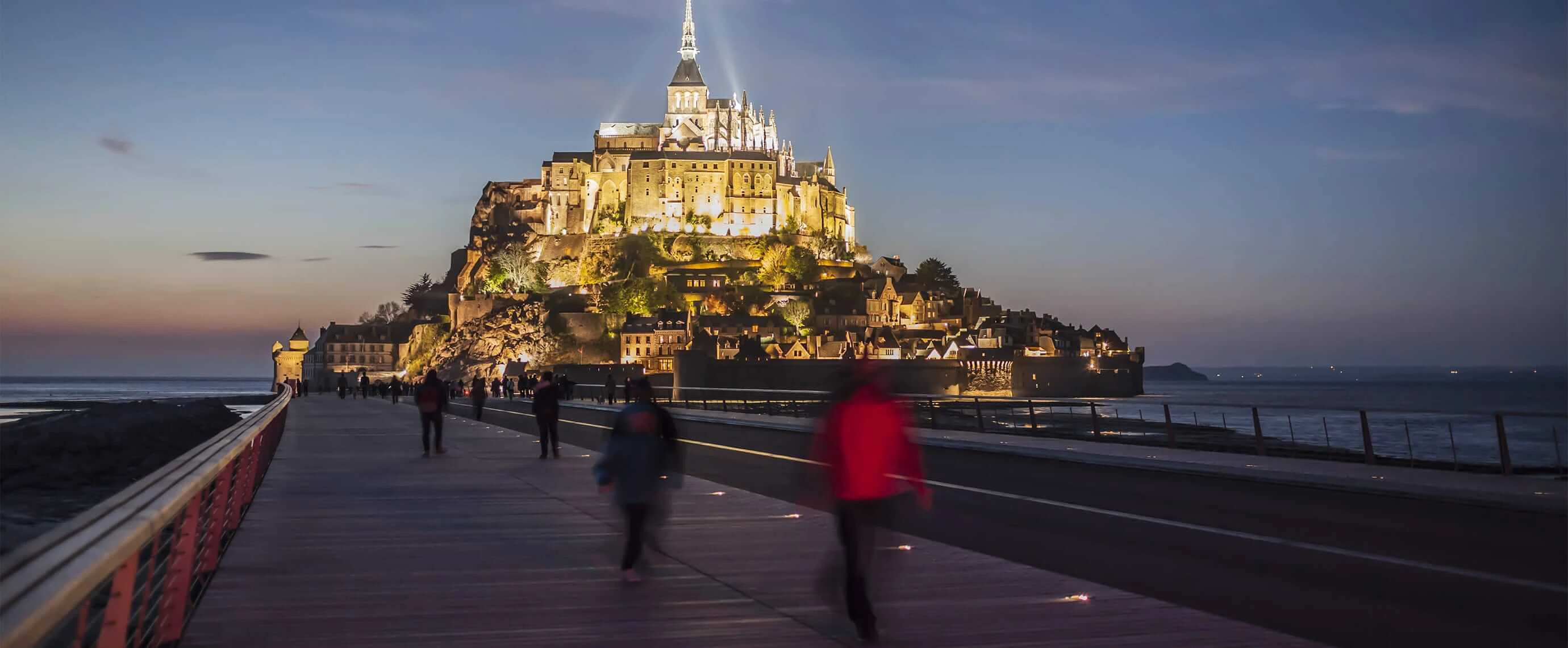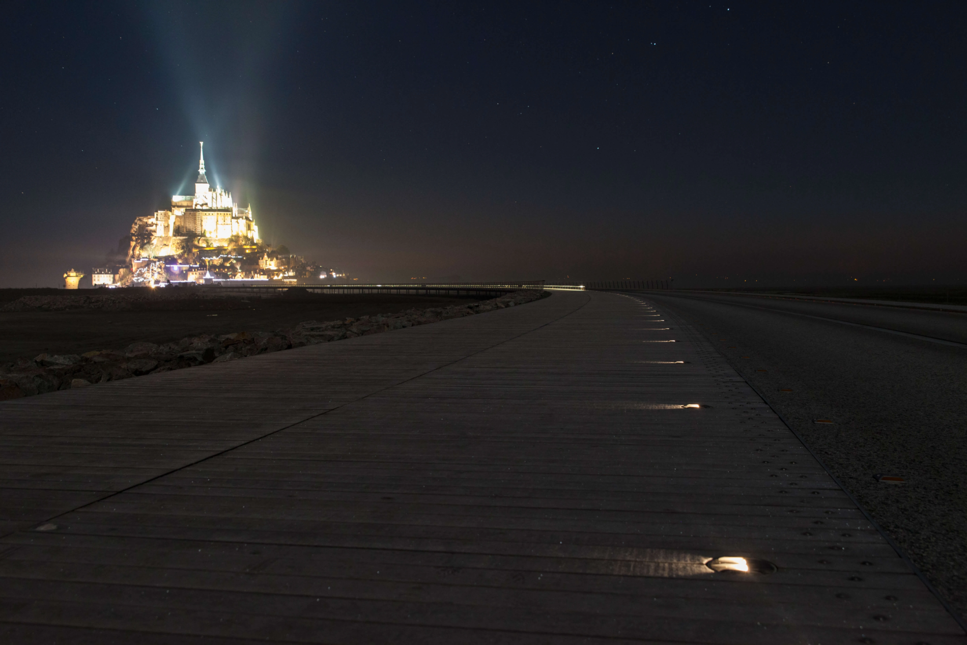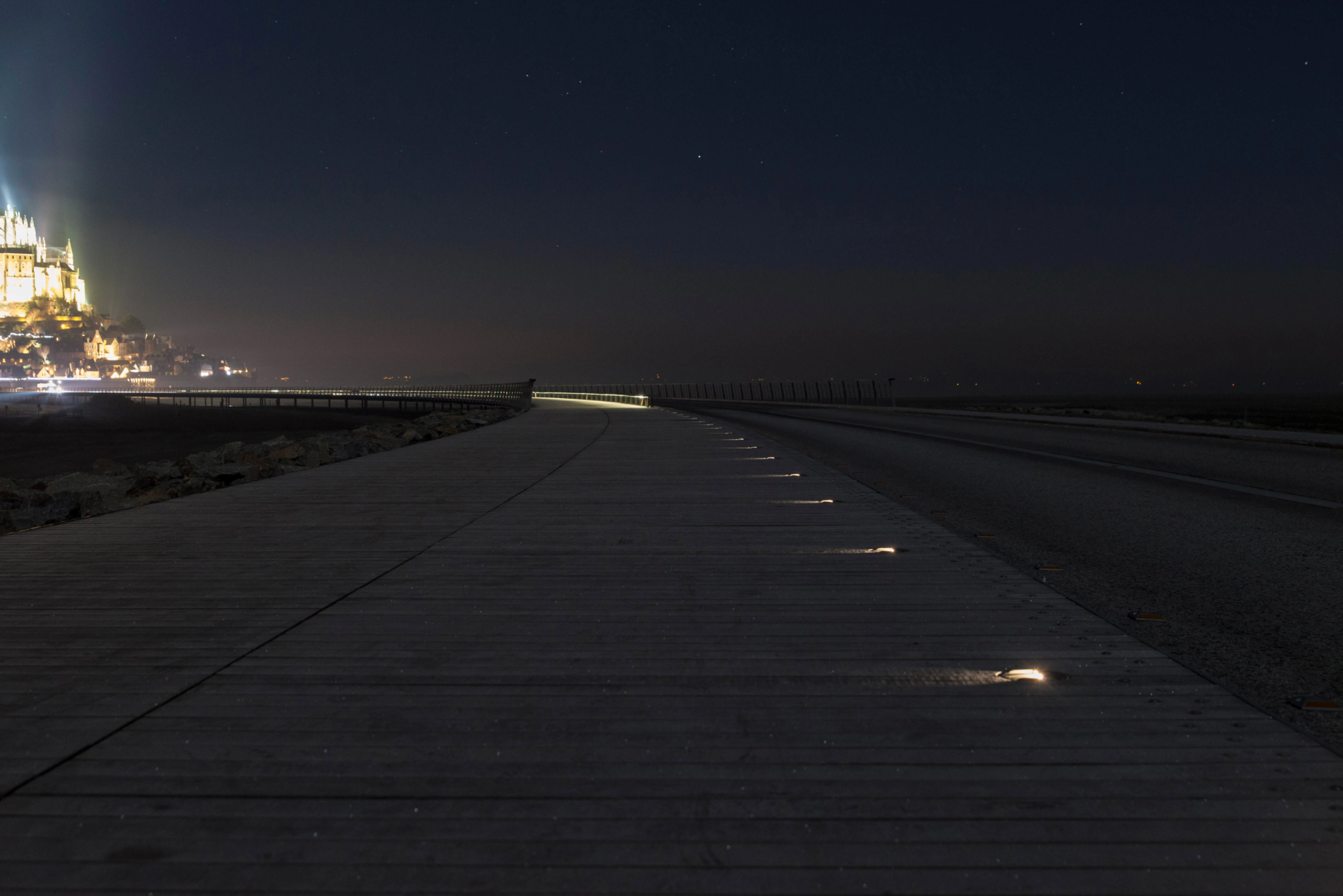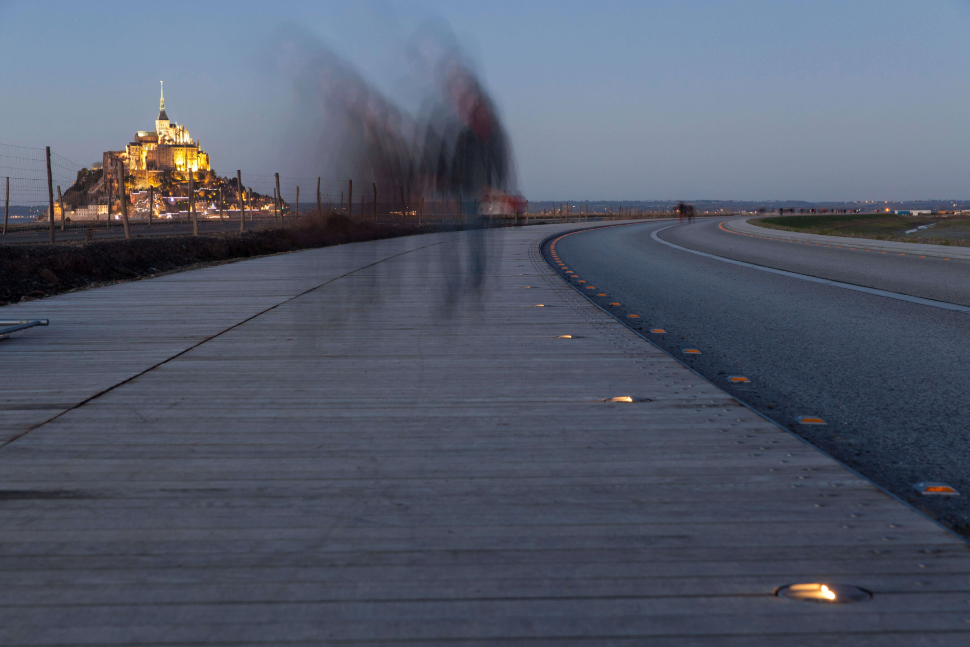 La pasarela que conduce al Mont-Saint-Michel está equipada con balizamiento luminoso LED para garantizar la seguridad de peatones y ciclistas, respetando al mismo tiempo el medio ambiente excepcional del lugar.