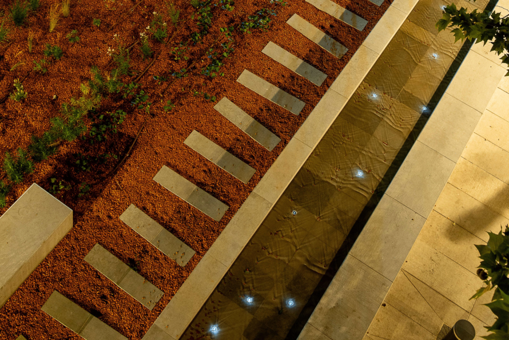 Dans le cadre de l’aménagement d’un parc urbain, des plots solaires immergés ont été installés pour assurer l’illumination décorative d’un bassin, sans aucune consommation d’énergie issue du réseau.