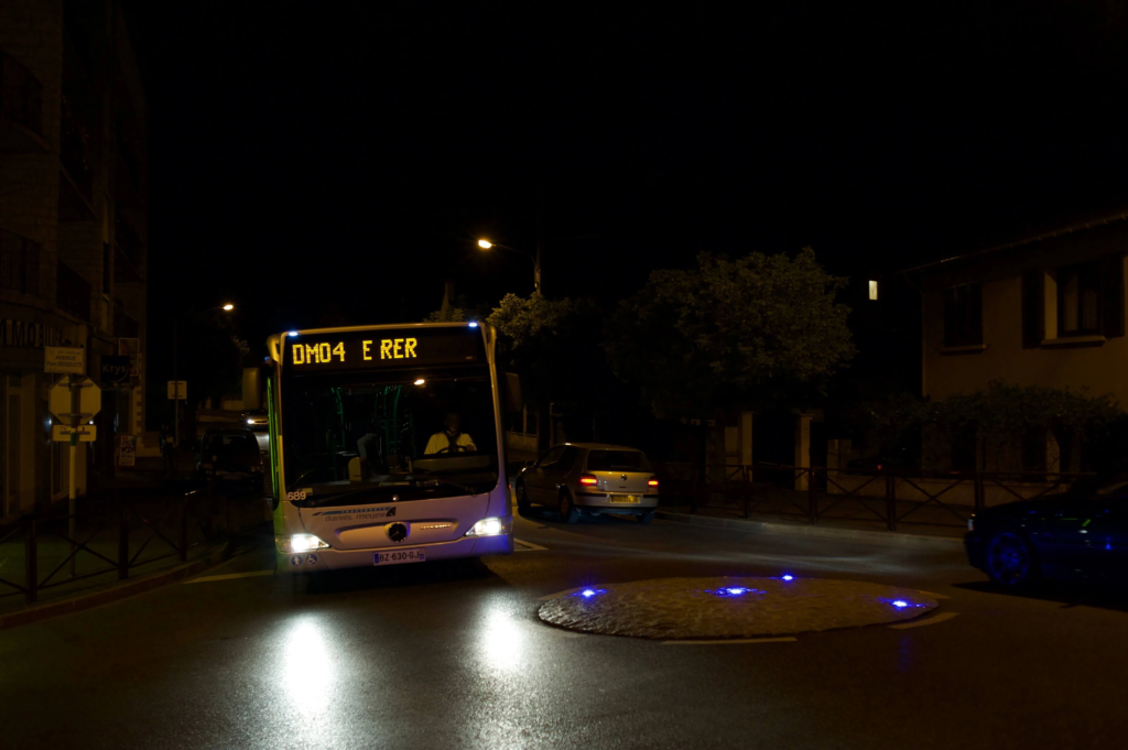 Un balisage LED de sécurité a été mis en place sur un mini-giratoire franchissable par les véhicules, situé en centre-ville, afin d’améliorer la lisibilité de l’aménagement et la sécurité des usagers.